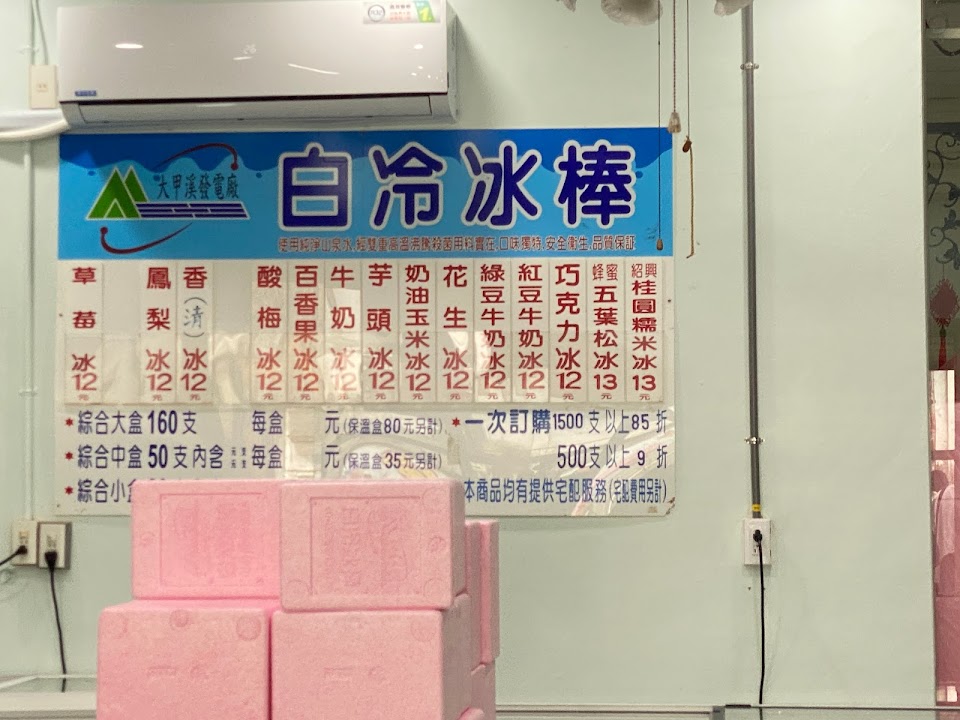 白冷冰棒位於大甲溪發電廠旁,由大甲溪發電廠員工消費合作社成立,店內自產的枝仔冰是採用過濾的山泉水煮沸後所製成,共有14種口味,除了五葉松冰以及紹興桂圓糯米冰,這兩種口味售價$13元,其於一律$12元!算得上是經濟實惠。