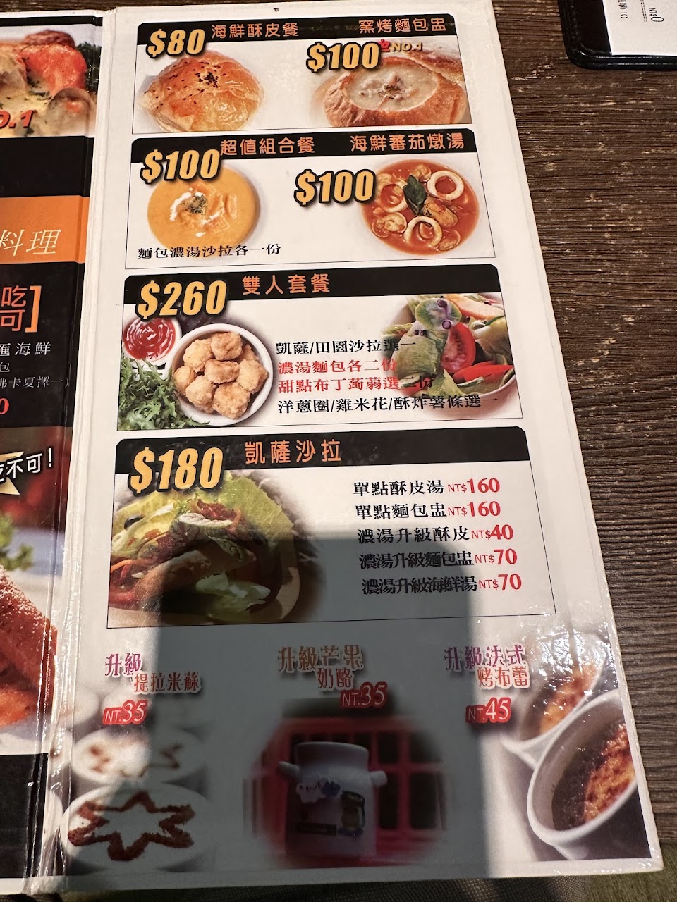 義大利麵偏軟 酥皮海鮮濃湯的味道普通 豬肋排也沒有到驚豔,下次會試試烤半雞 服務人員非常的親切