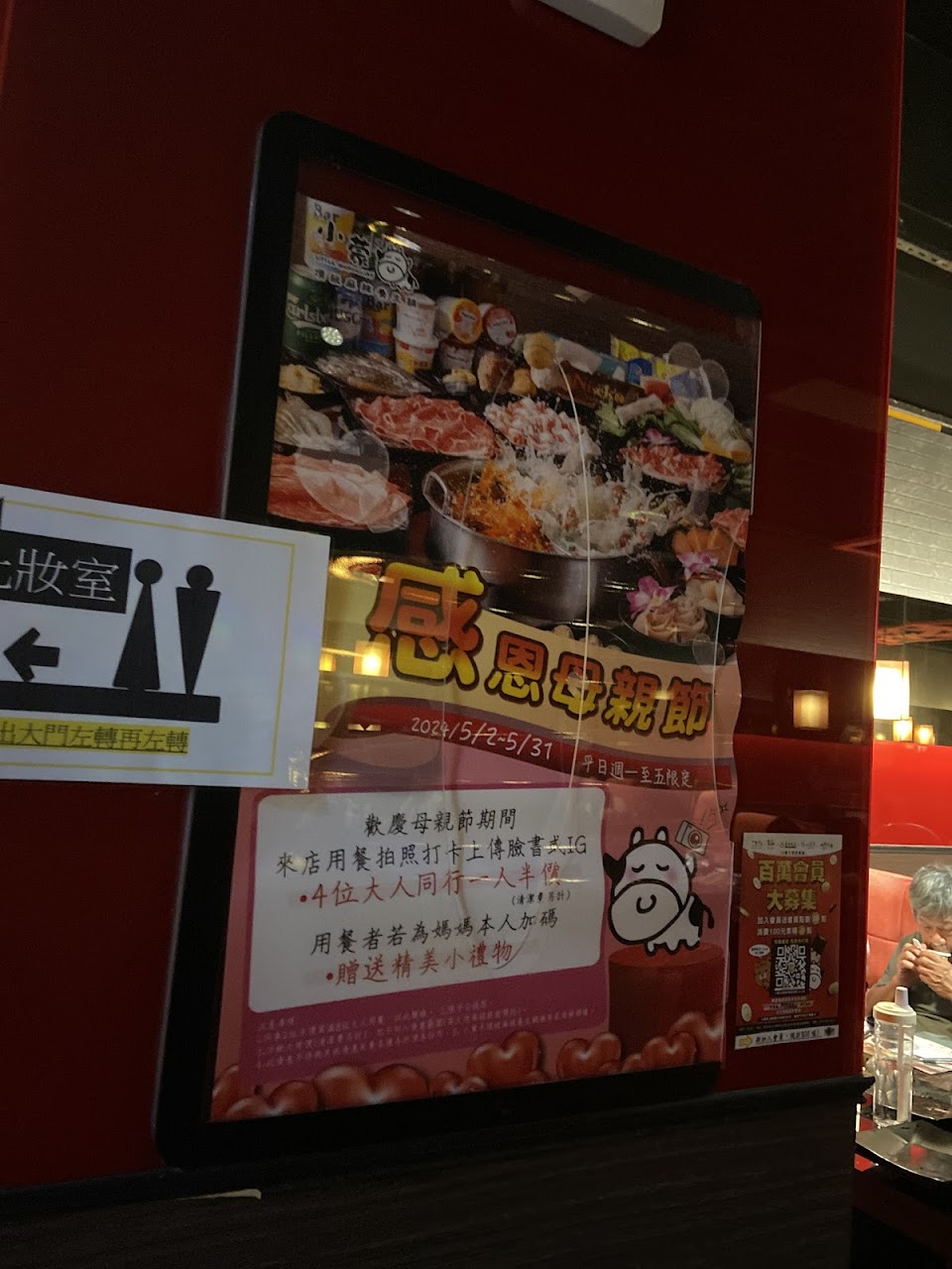 今天環境跟服務人員部分真的很扣分,感受很差,其實當天用餐人數真的不多,10跟手指頭數的出來約莫才6桌吧,我們訂位是8點可能大家都早早吃完了才剩這幾桌而已,醬料區有幾隻小蒼蠅在飛,感受不好,而且8:40分服務人員就來問還有沒有需要用到醬料,8:50還沒九點就來問有需要再點火鍋的部分……是在哈囉~不是點餐90分鐘用餐120分鐘嗎?還沒用餐1個小時就想趕客人走嗎?趕下班???