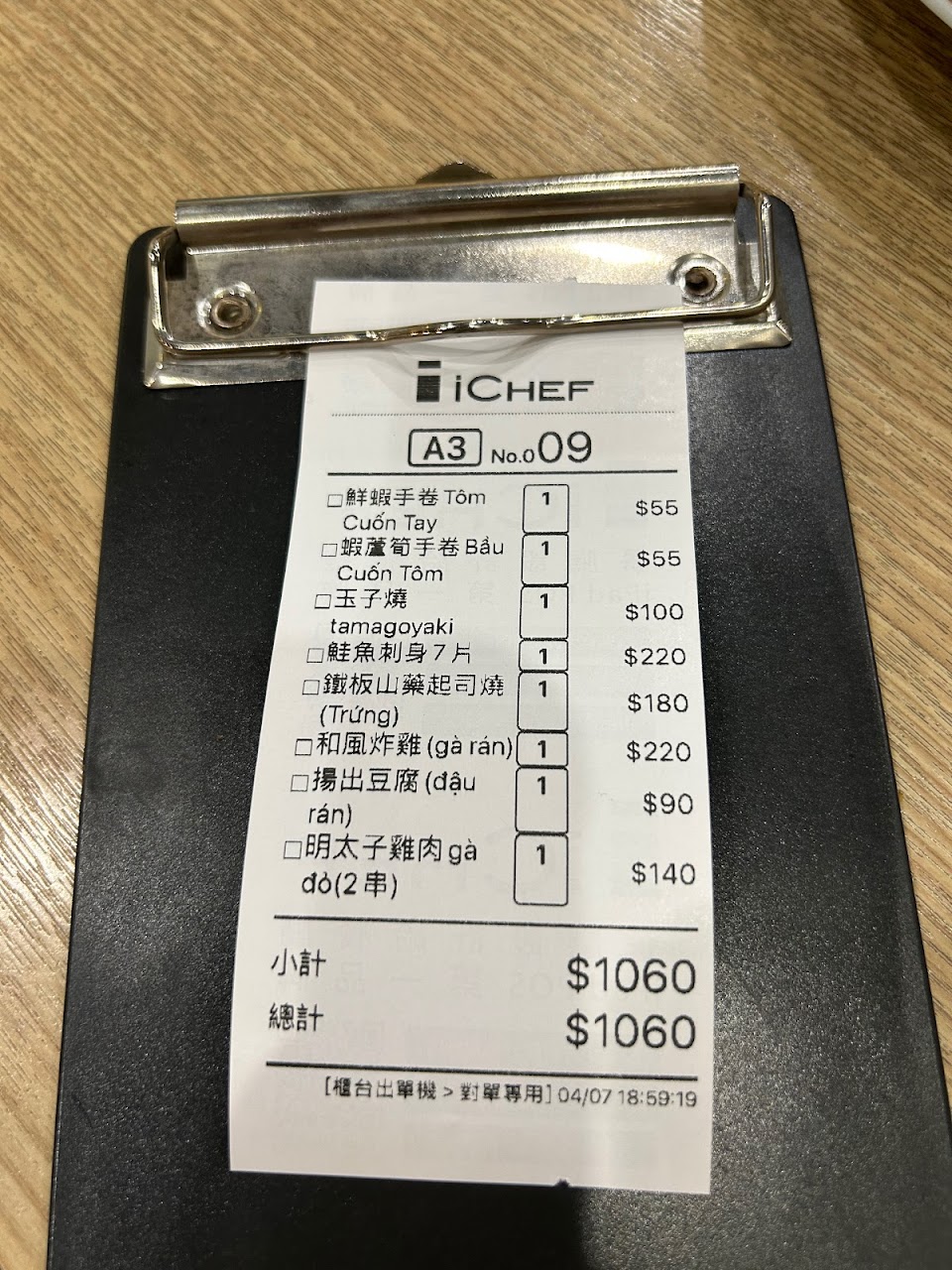 兩個人點了玉子燒、手捲*2、鮭魚刺身、揚出豆腐、鐵板山腰起司燒、明太子雞肉、和風炸雞,這樣吃,很飽!