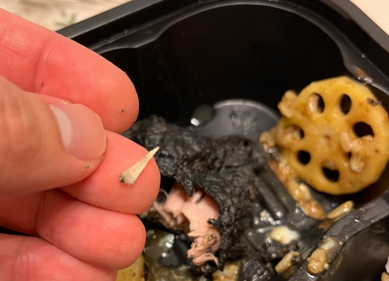 今天點了一份黑嚕嚕雞便當,吃到一半發現吞到一顆硬物。後來放慢吃,又被戳到牙肉,原來是骨頭碎片….還蠻鋒利的…幸好這一次沒有吞下去…