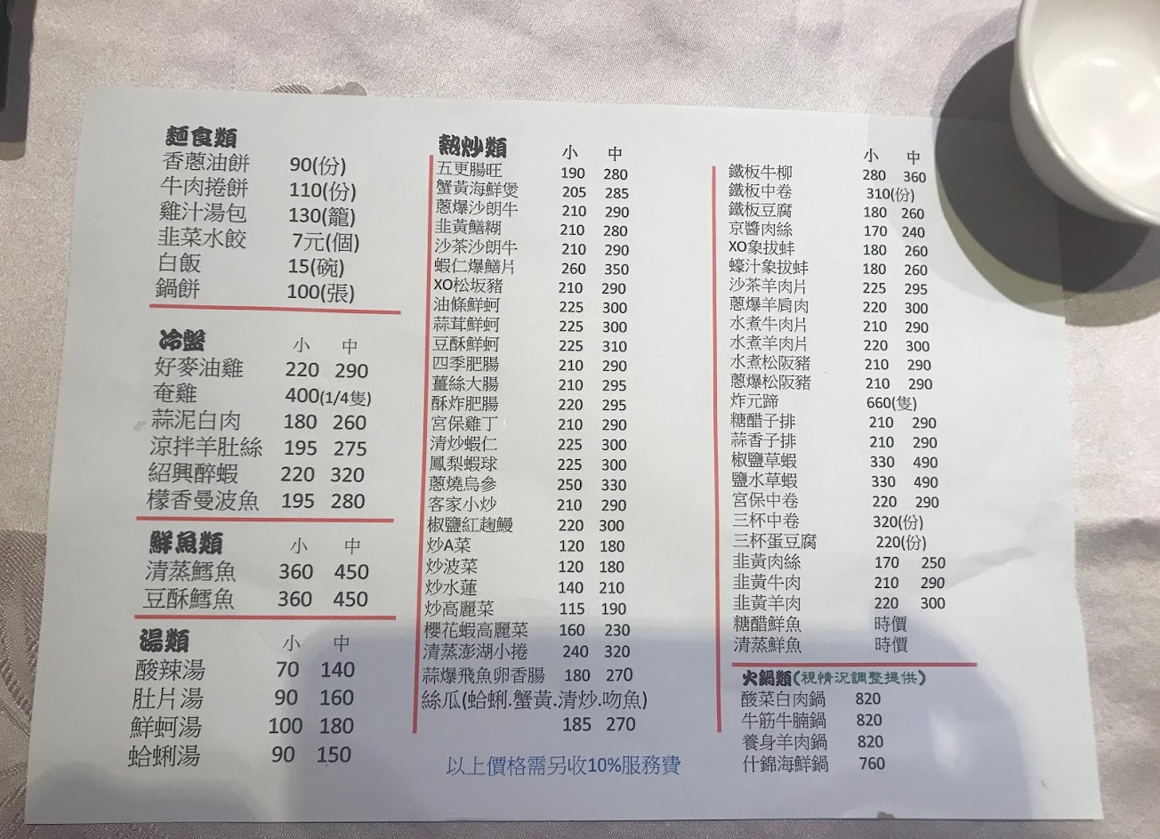 麪食類食物如葱油餅, 水餃, 小籠包等都算美味, 單點菜菜色很多可供選擇, 也有提供酸菜白肉鍋等鍋類菜色, 在菜單上看起來價格普通不算貴, 但實際上菜時,份量實在不多, 所以顯的價格不便宜, 如果在泰山來看算是高價餐廳