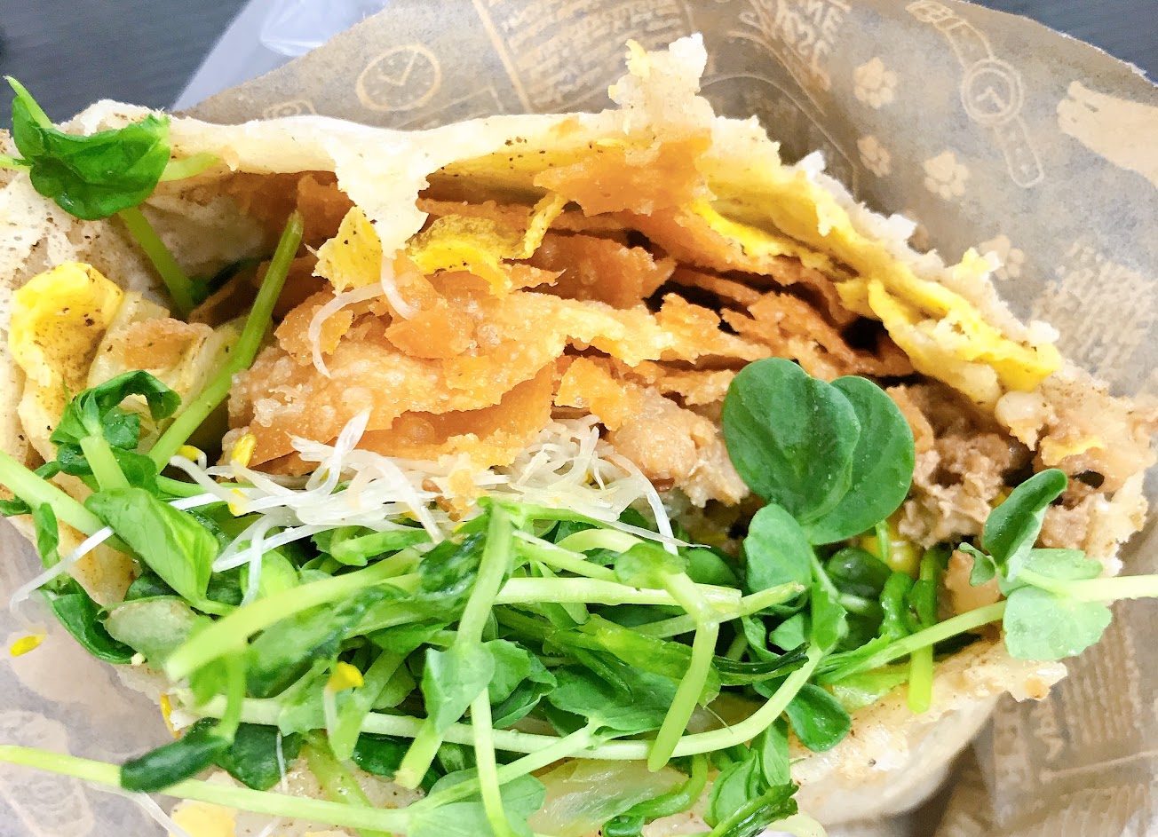 煎餅果子有很多的苜蓿芽與高麗菜絲