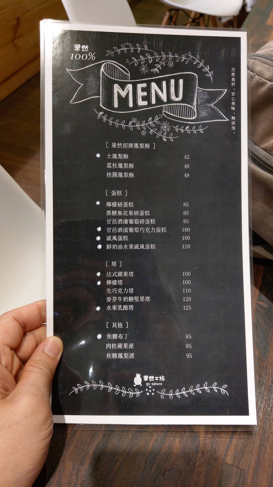 草莓塔 —— 135元 藍莓塔 —— 125元 拿鐵 —— 120元 卡布奇諾 —— 100元 鳳梨酥 —— 45元 (特價:小盒六顆270元,大盒十顆裝420元)