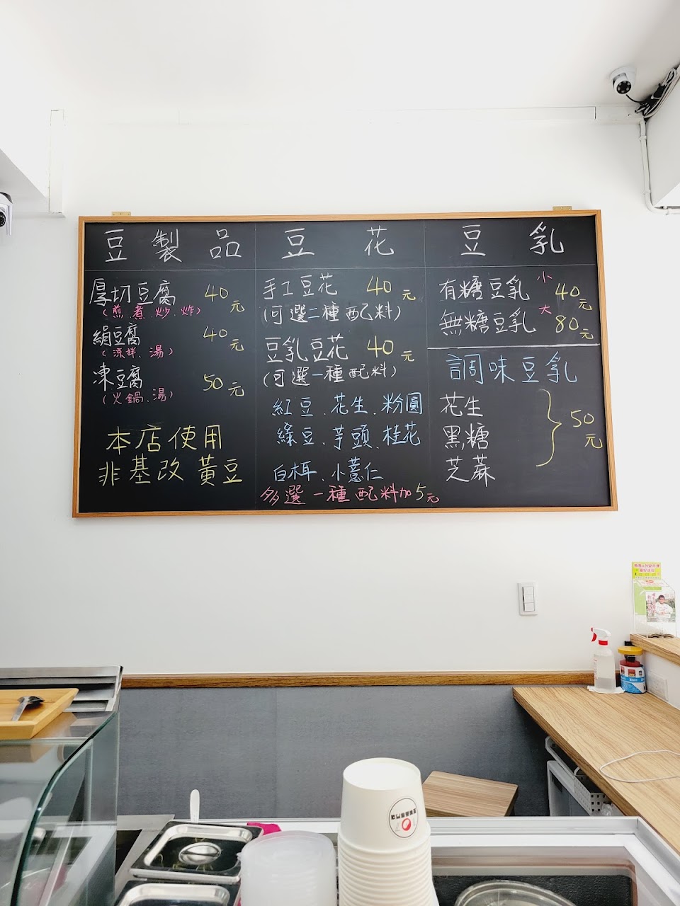 令人驚艷的豆乳豆花,豆香濃郁、口感綿密細緻、甜度適中,濾得很乾淨無豆渣感,花生綿密優秀,一份$40份量多,外帶厚切豆腐回家料理也好吃。店內簡約乾淨。