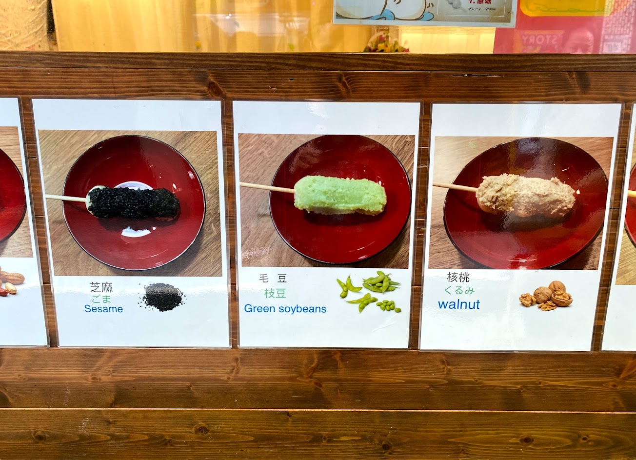 販賣的糰子口味很多種,有紅豆、醬油、花生、毛豆、核桃、芝麻跟原味糰子多種選擇。