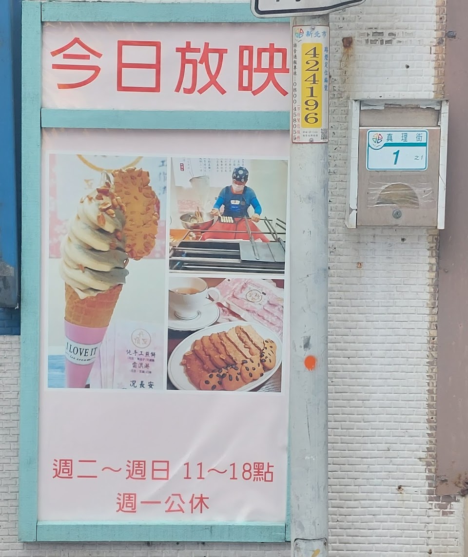 位置靠近真理街創始阿給老店旁,真材實料的霜淇淋,有別於淡水街道上一般巨無霸霜淇淋,有花生與芝麻或綜合口味,點了個綜合覺得芝麻較香配上手工花生小煎餅很可口對味,老板與老板娘態度親切讓人吃冰很享受!