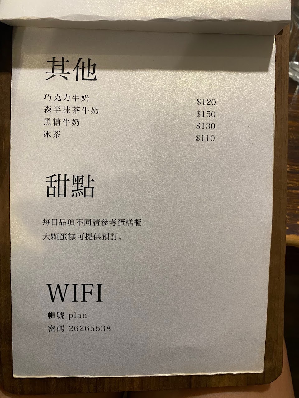 佢主要提供自家製蛋糕、咖啡? 店內有個蛋糕櫃會放左當日嘅自家製蛋糕 (ig亦會公佈) 有6-7款 包括千層蛋糕、戚風蛋糕等? 價錢TWD180-200不等(大約HKD$45-50不等)?? 要留意佢低消每人一杯飲品 甜品唔可以當低消?