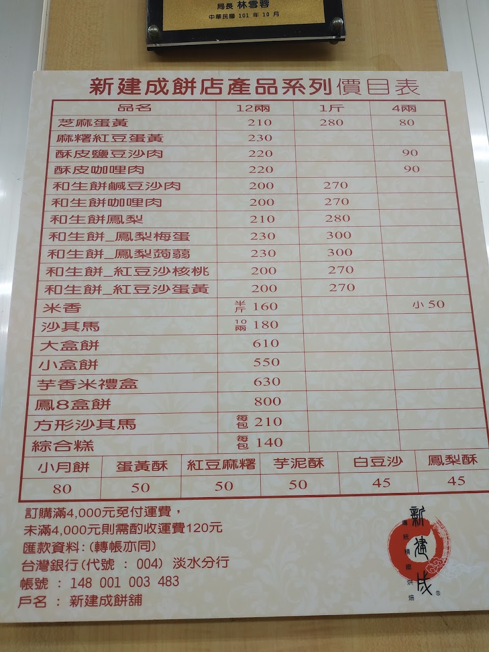 原本要來訂購結婚喜餅,可是店家態度非常冷淡,但是我還是買了四塊大餅回家試吃,結果讓我對老招牌的字號感到非常心灰意冷,以前常常聽老一輩的人說新建成多好吃,第一次買回來吃餅皮厚不說內陷也非常少