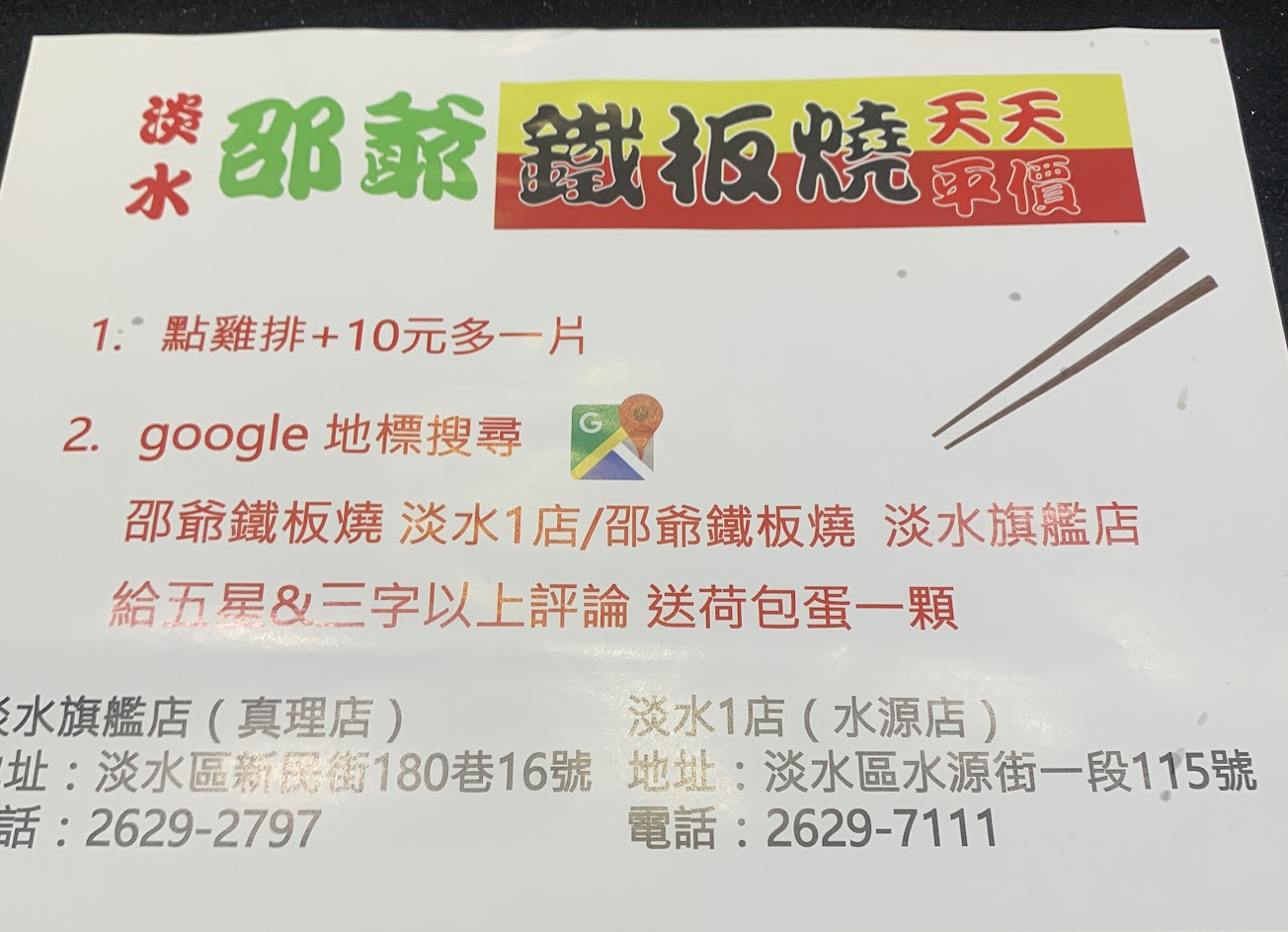 淡水只推這鐵板燒 店內的阿姨 他高傲,但是宅心仁厚; 他謙虛,但是受萬人敬仰; 他可以把神仙賜給人類的食物運用的出神入化,可以把高麗菜炒出堪稱帥之藝術的超級完美! 他究竟是神仙的化身?還是地獄的使者?沒人知道! 但是可以肯定,每個人都給他一個稱號…… 淡水最划算又好吃的鐵板燒!