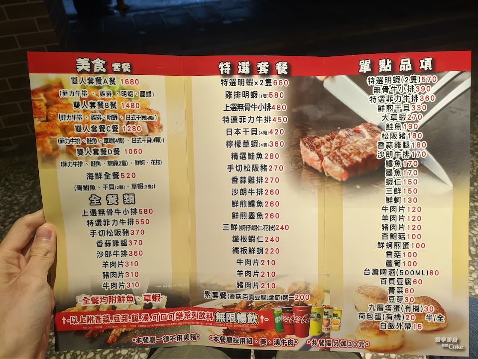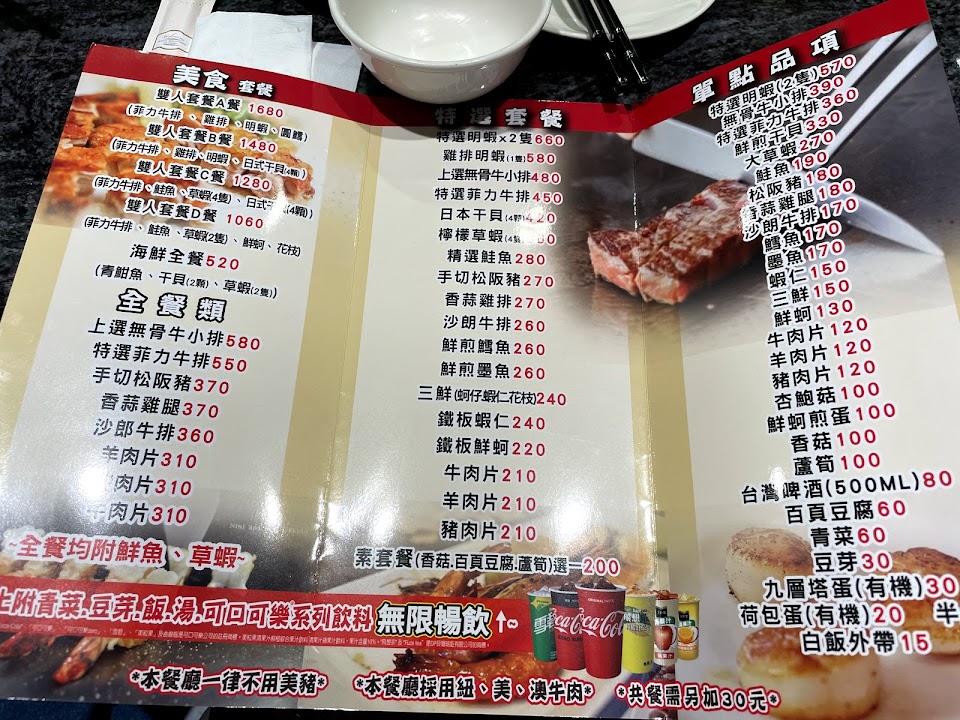 非常推薦沙朗牛、三鮮、雞排、松阪豬?