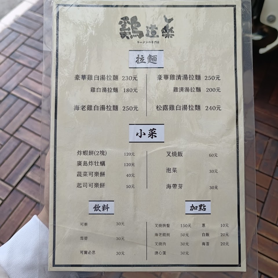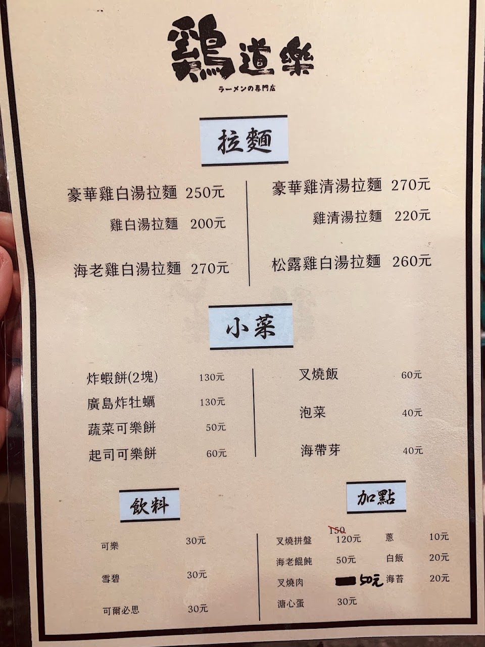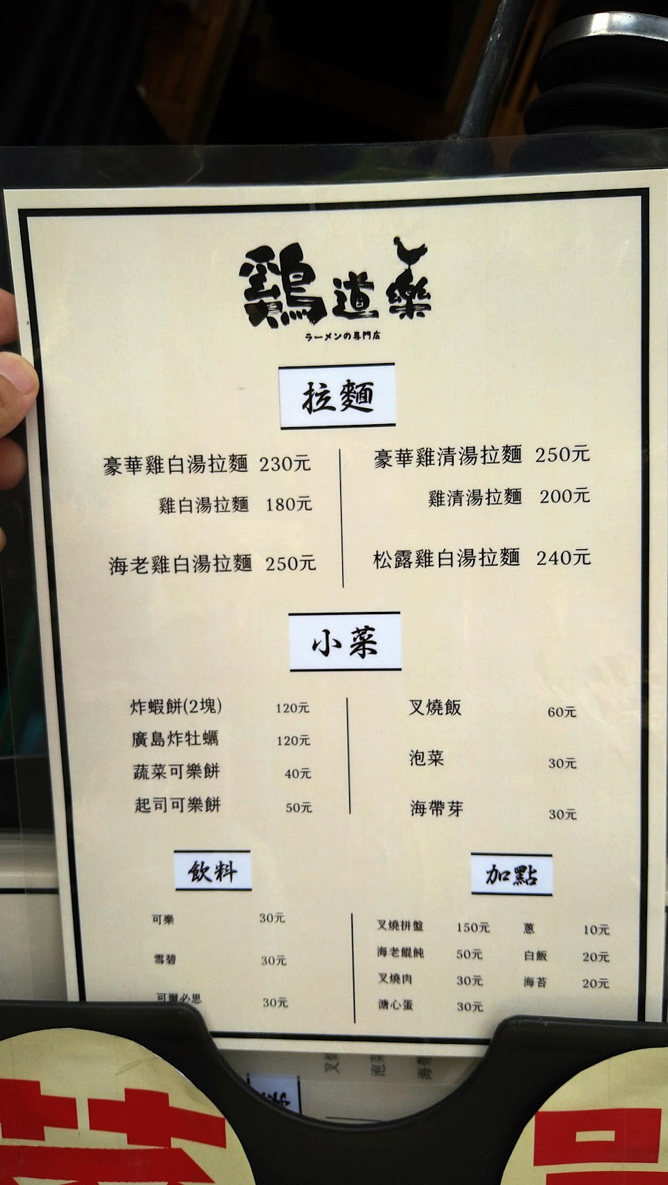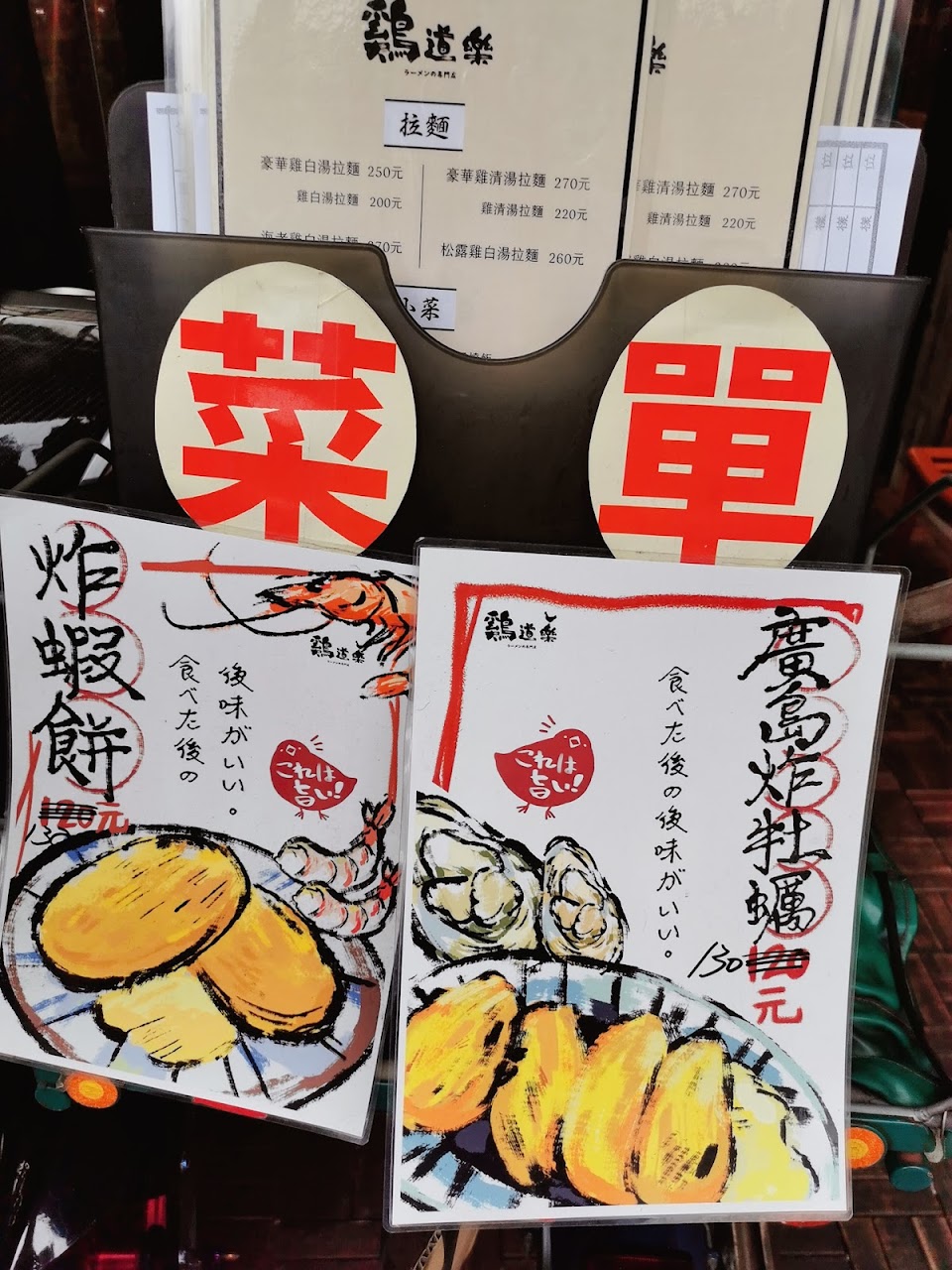 道樂體系的分店,開在淡水老街旁,算是很顯眼且方便的位置。把其他店面廣受好評的雞白湯獨立拉出來做定番,除此之外還加上了雞清湯,整間店都是以雞作為主題。