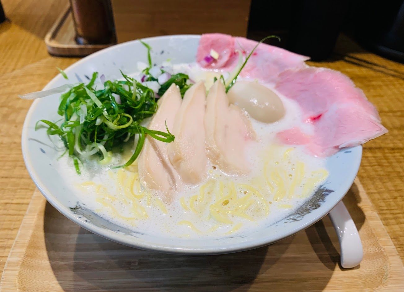 #豪華雞白湯拉麵 湯頭是雞湯清甜中帶著奶香, 不厚重反而感覺很嫩很潤口。 (但喝到最後還是會微微膩??) 配料有:薄叉燒2片、舒肥雞3片、洋蔥丁、蔥段、高麗菜、溏心蛋1顆 .