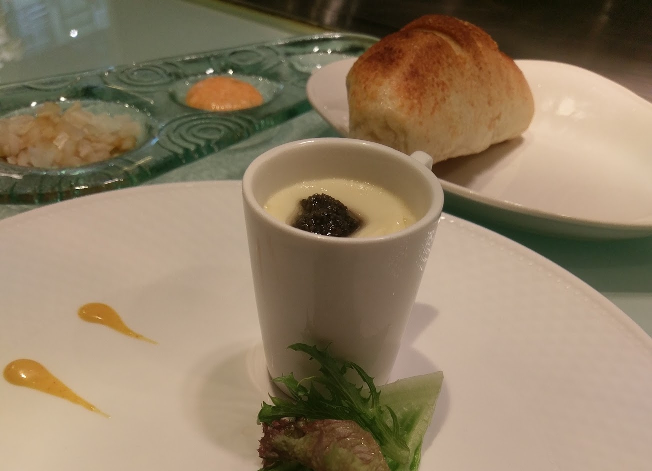 一開始會來一份帕瑪森起司麵包,搭配蒜香魚子醬,以及用日式醬油醃製的洋蔥小菜,麵包跟魚子醬可以一直續,魚子醬好好吃可是吃多會鹹。