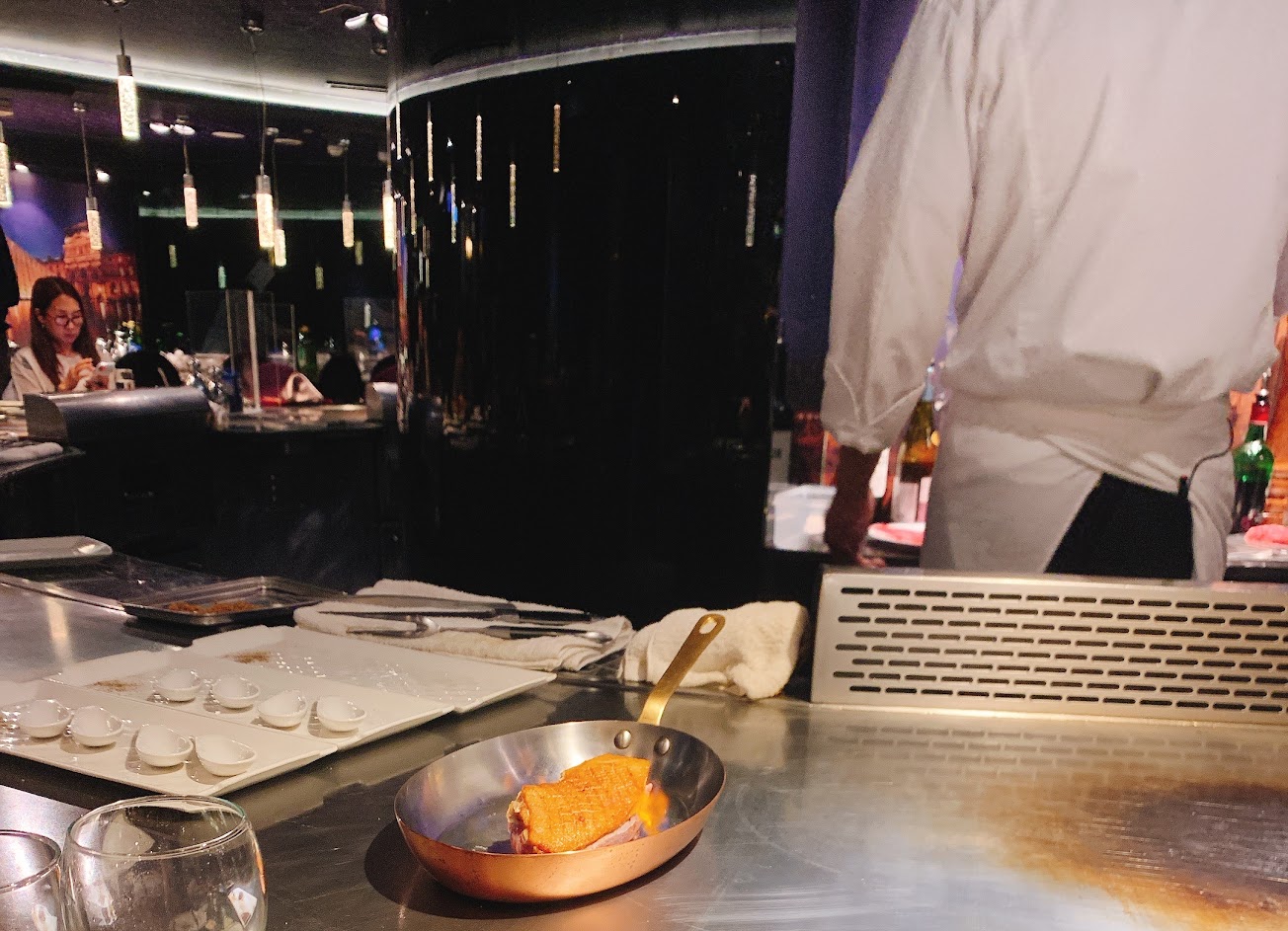高價位鐵板料理,帕瑪森起司麵包,櫻花蝦炒飯,香檳,檸檬沙瓦都可以續加,鴨胸一樣好吃. 份量很足,牛排會先上一半讓你確認熟度,如果滿意再將剩餘的一半上桌,也會貼心的將不同部位分開料理,廚師也會詳細解說. 松露百菇沙拉非常好吃,松露蒸蛋也很軟嫩, 唯獨甜點吃起來感覺十分普通,另外可能為了增加換桌率,食用附餐甜點飲料的地方冷氣實在太強. 這點有點可惜.
