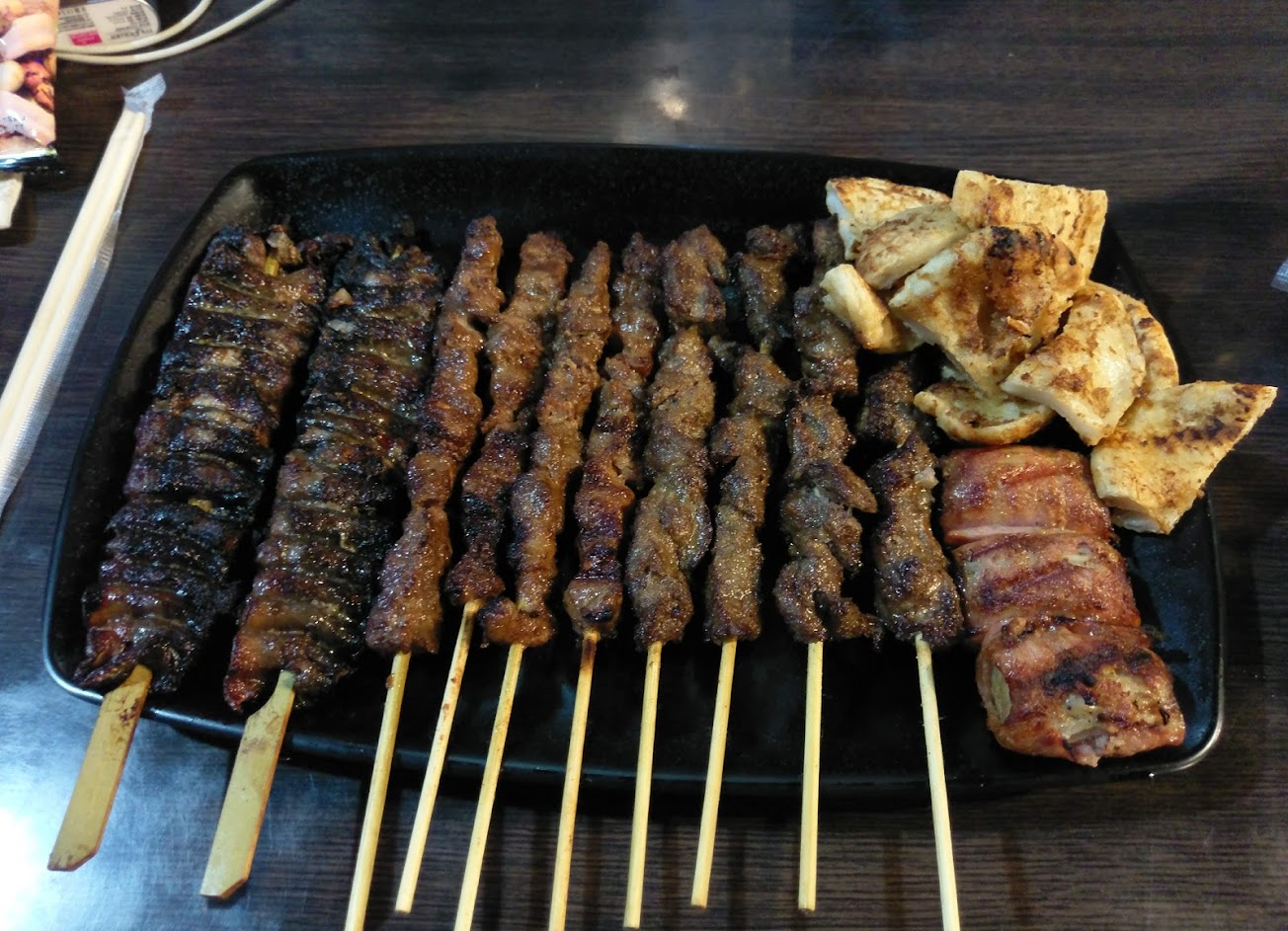 串燒種類多、烤醬很香、吃起來不會很油膩還有熱湯!