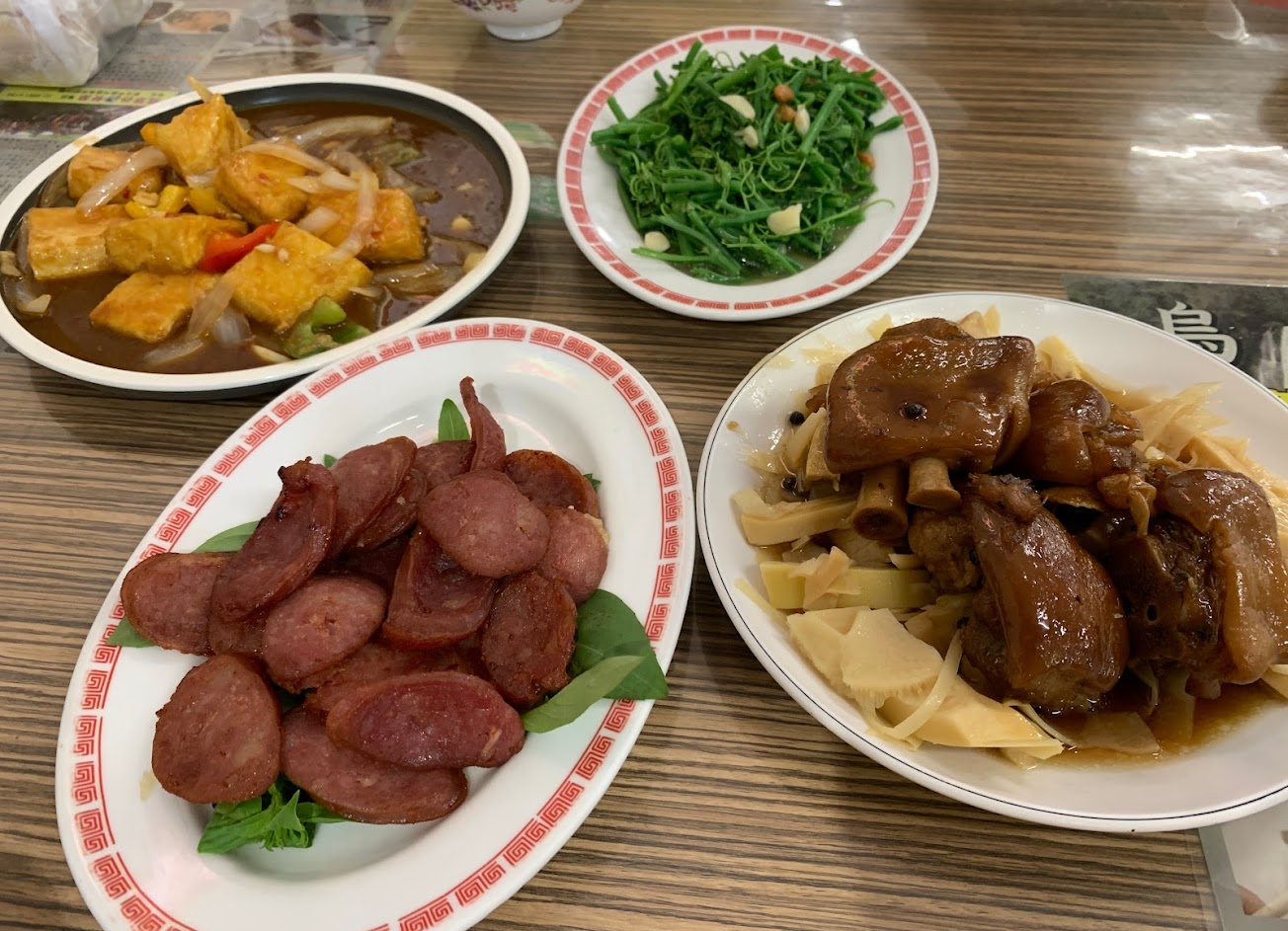 馬告煎蛋口感很特別,素的竹筒飯內含芋頭、豆輪塊和蓮子很好吃,炒青菜很香很好吃但有點油