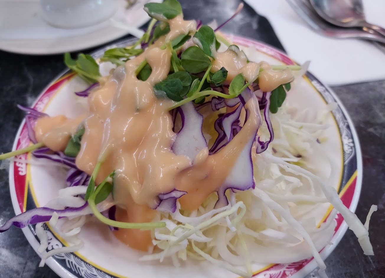 牛排本體比預想的好吃,鐵板麵不怎麼樣。提供免費蔬菜沙拉和飲料吃到飽,還有免費酥皮湯。蔬菜沙拉區有豆苗,千島醬比較甜酸度低,吃起來清爽。