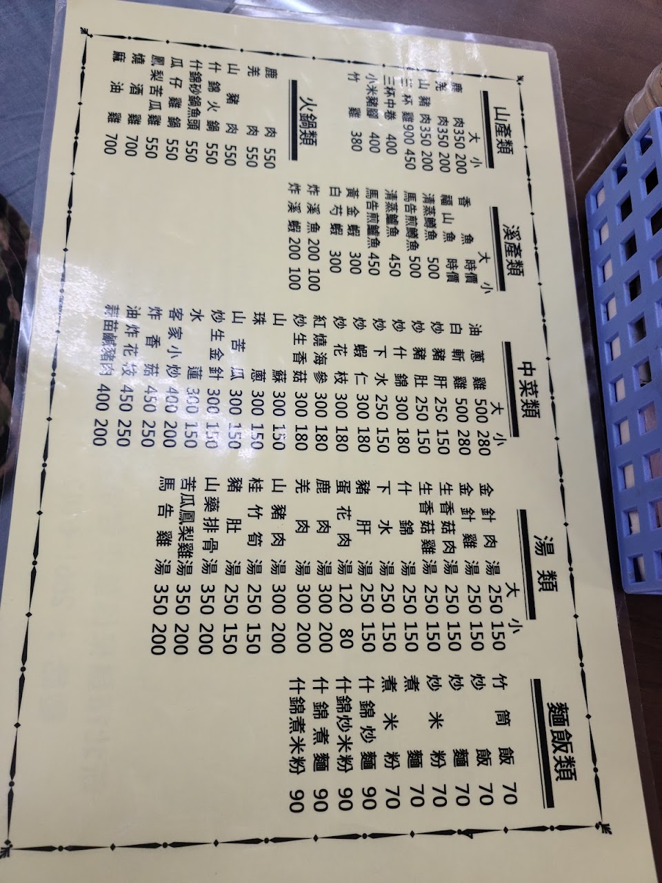 帶位走到最裏面我愛的窗邊桌,山瀾與潺潺流水,向外看去真的很舒服,空氣也很好。 依慣性請老闆介紹菜色提供參考,點了4菜1湯(珠蔥炒蛋、油蔥雞、炒生香菇、混炸溪蝦溪魚、馬告雞湯),加特色小米白飯。