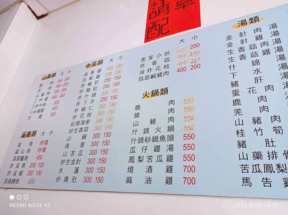 依慣性請老闆介紹菜色提供參考,點了4菜1湯(珠蔥炒蛋、油蔥雞、炒生香菇、混炸溪蝦溪魚、馬告雞湯),加特色小米白飯。