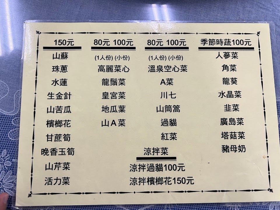 點了炒溪蝦、炒山豬肉、溫泉空心菜 份量很多又好吃,價格也不貴 老闆老闆娘服務態度也很好,值得推薦!