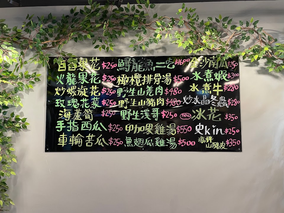 有很多特別的野菜可以選擇,可惜當天來晚了,沒機會吃到冰花,索性點了在其他地方也沒看過的百香果花,吃起來蠻特別的,有股萵苣的青味;情人的眼淚炒蛋也很對我的胃。不過炒山豬肉的部分表現就略微普通了些。