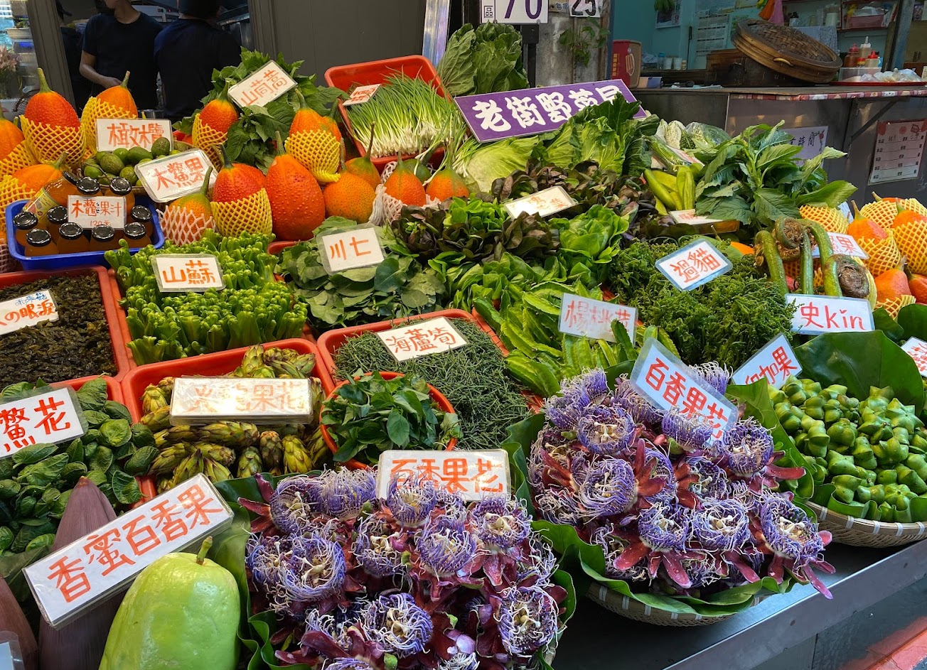 被門口擺放特別的菜類吸引,手指西瓜、百香果花、楊桃菜。