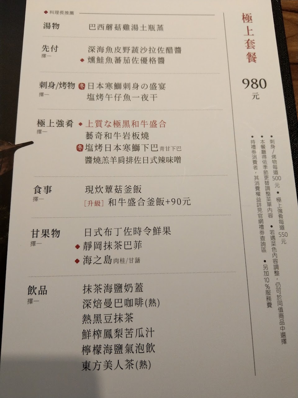 今天點經典套餐$780和極上套餐$980各一, 就是喜歡這裡的環境 ,東西好吃,湯和小菜可以續,服務好,對面有停車場非常方便? …