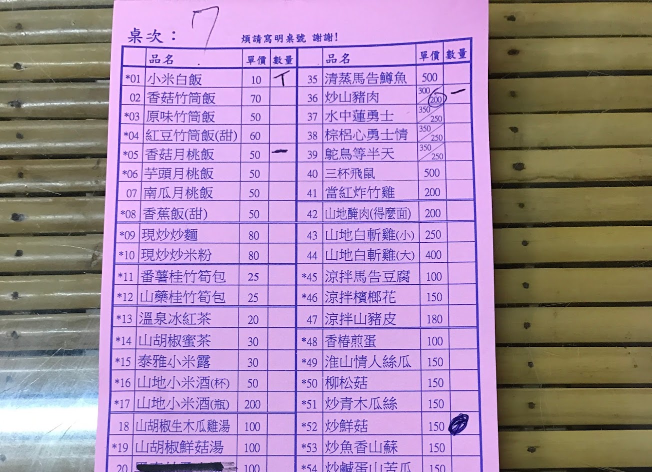 There is a variety of choices, including indigenous atayal cuisine. We ordered deep fried river fish and shrimps (they are tiny but pretty good), preserves boar meat (I am not a fan of its sour taste), trout (not fresh and over cooked), wild vegetable (good), indigenous sticky rice in bamboo and leaves (good!), and free range chicken (good). Staff is kind and the place is clean.