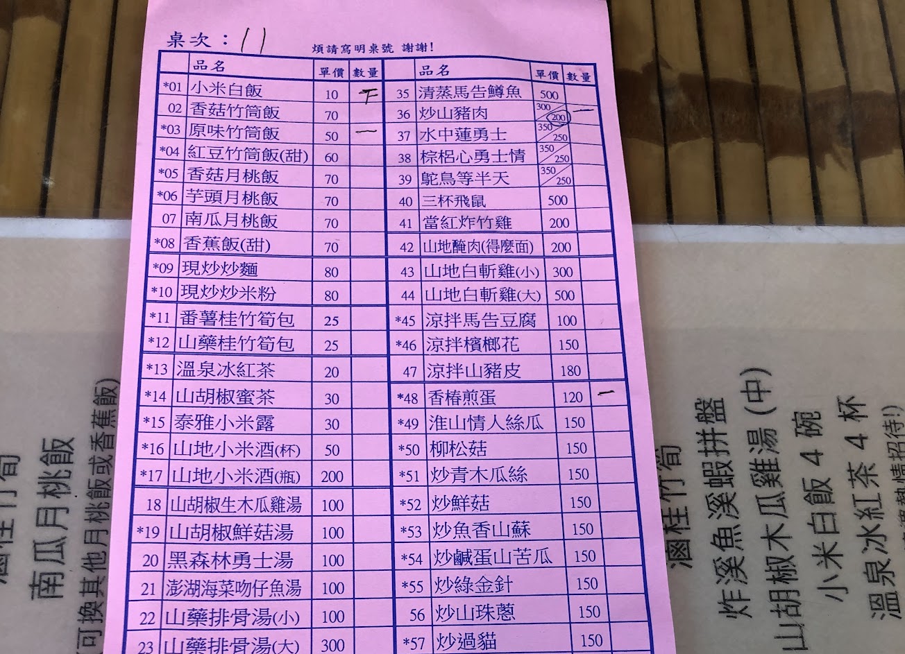 不太好體驗, 炒山豬肉無味, 要和九層塔一起吃才有味, 馬告雞湯, 湯可以, 但雞肉無味不堪入口, 炒過貓不過不失, 溪蝦太乾, 溪魚有咬口。