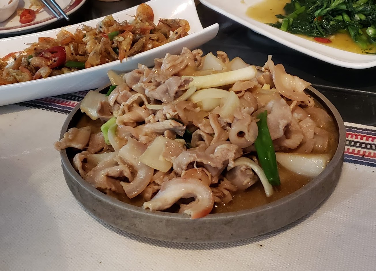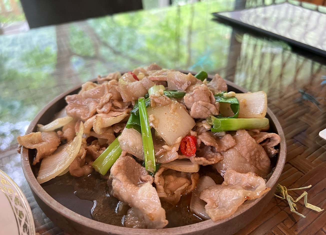 酥炸溪蝦、炒時蔬、蔥爆山豬肉、山菇、糖醋鱘龍魚、季節竹筍燉肉、馬告養生雞湯