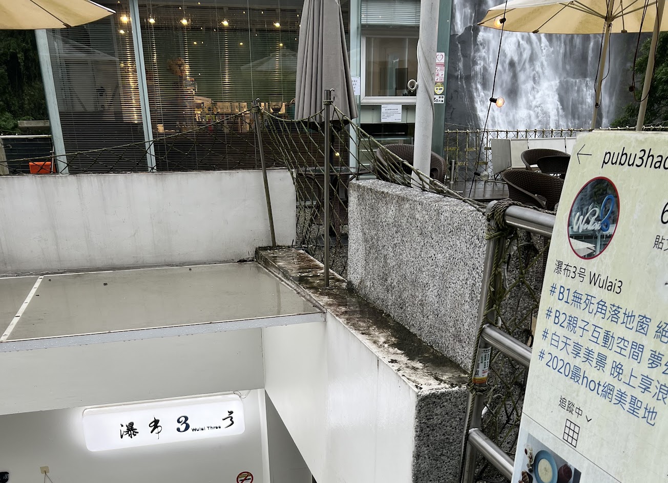 這裡有1樓的露天咖啡座台、也有地下一樓的室內的空間、及地下二樓的親子區。因為社群媒體的推波助瀾、加上美景搭餐的享受,讓這裡瞬間成為著名的瀑布景觀餐廳,連周杰倫都曾造訪過。其中正對瀑布的那一桌座位,老闆特別擺放了裝飾小物,不開放用餐,就是為了讓旅客有更好的位置拍照打卡呢!