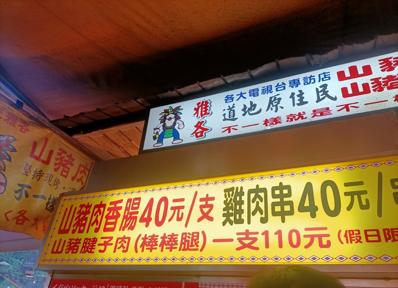 在兩旁的店面賣小米酒、山豬肉香腸、山豬烤肉、小米麻糬、也有些醃漬的小菜罐頭等⋯