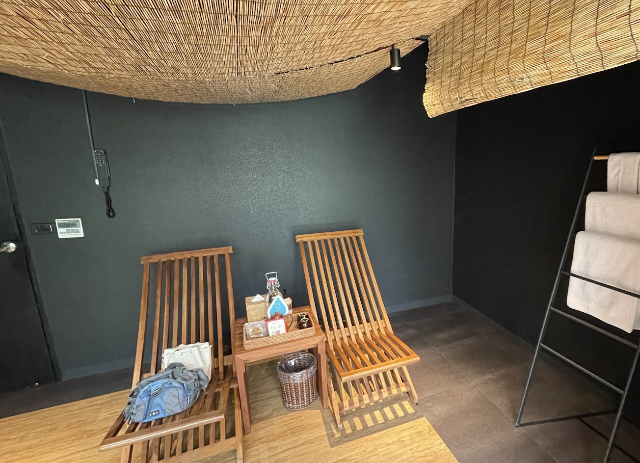 森沐湯屋內,半開放的空間,讓整體視野相當開闊,也能直接聽到森林萬物的鳴叫聲