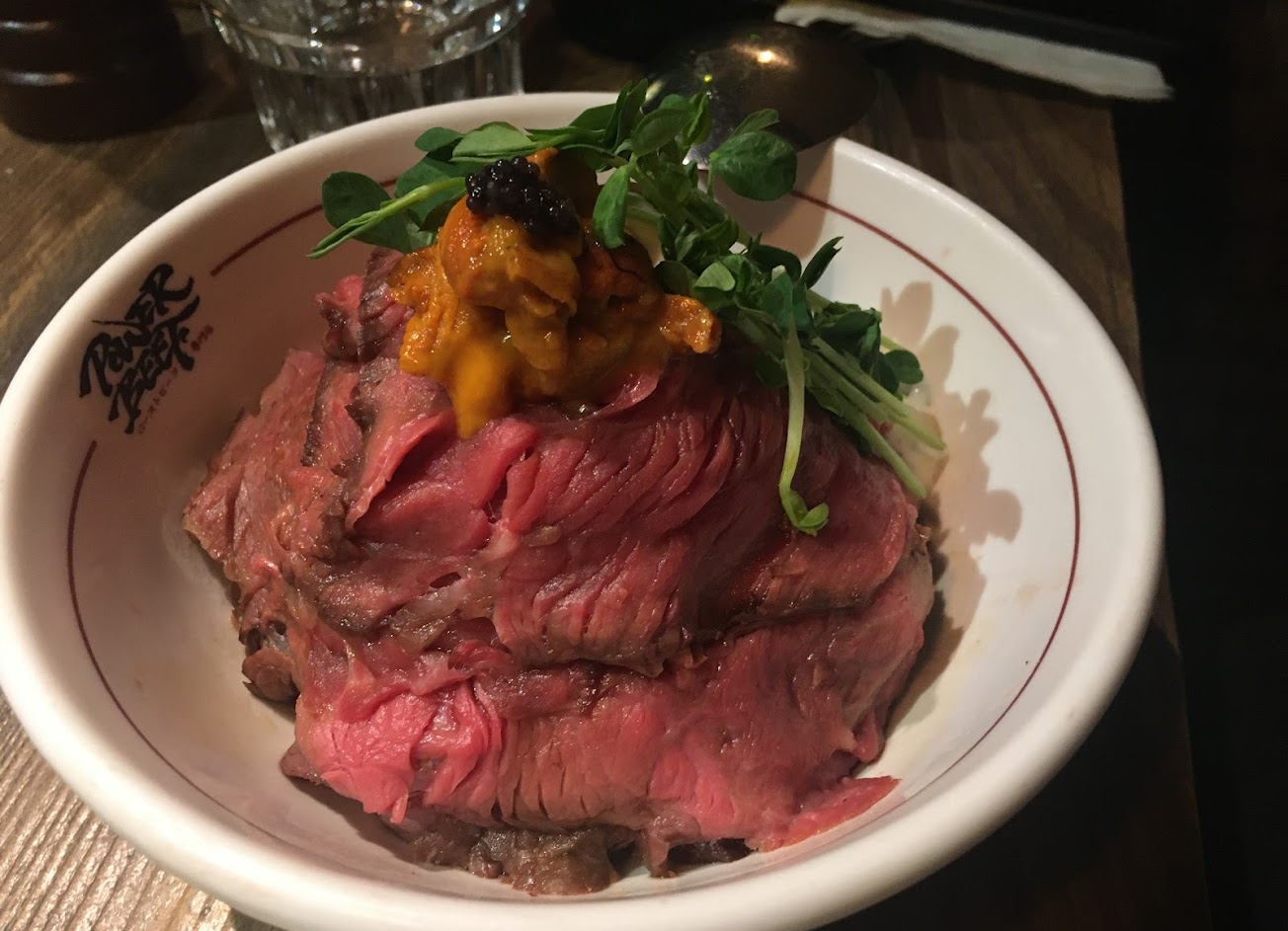 氣氛很棒,但是餐點cp值不高。 當天海膽要另外加錢,但是味道覺得稍嫌普通,牛肉的味道也沒什麼特色。
