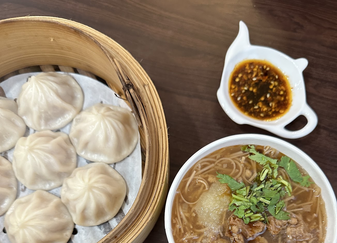 皮薄多汁,一口下去十分鮮甜,內餡飽滿~好吃;沾醬碟子是可愛的茶壺形狀,另外辣油的辣度沒有很辣