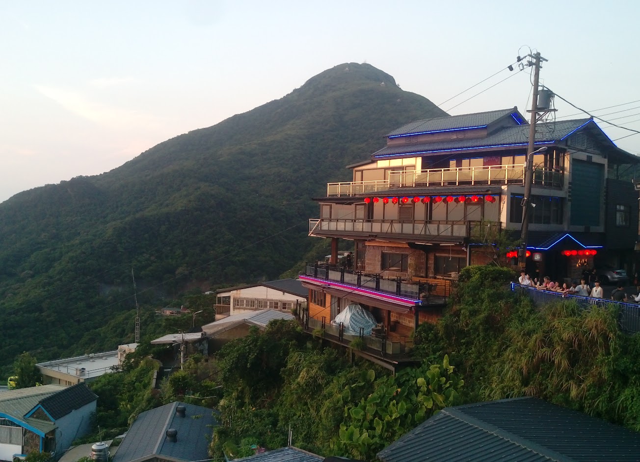 九份的重頭戲,往須崎路上走,碰到裕濱路有個“廣場”,對面就是一家店。舊樓已改建為餐廳。廣場上掛著許多“久野茶語”的紅紙燈籠。紅燈下的建築很有品位。