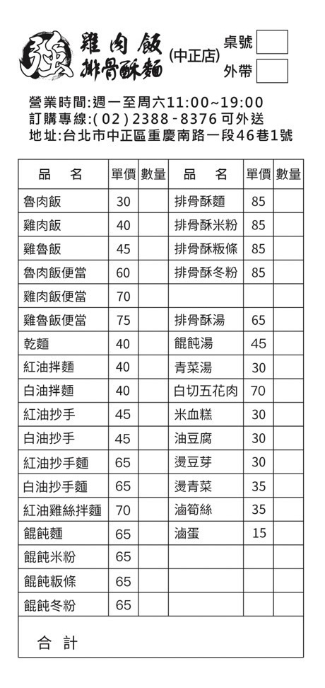 四、中正區單筆滿300元有外送,早上10點前先電話訂餐。很多外送是附近的銀行、上班族。