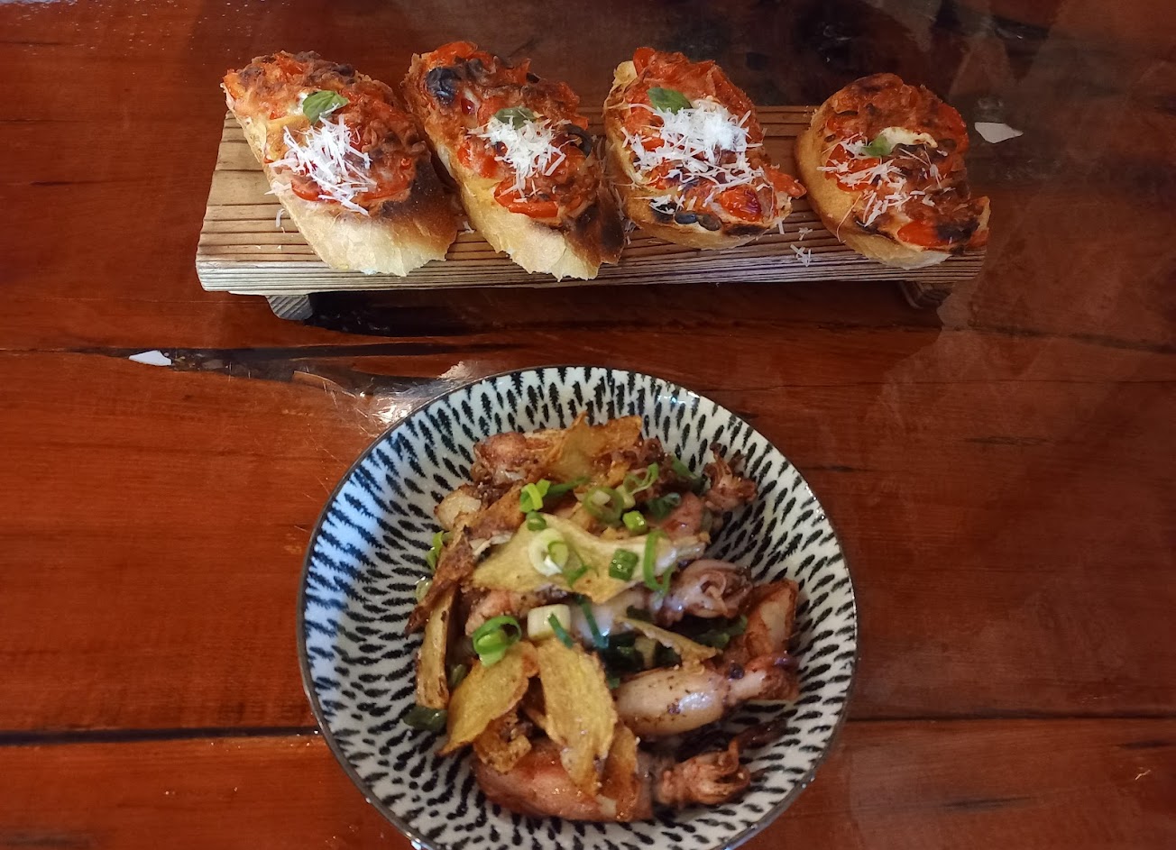 番茄麵包:調味滿意外的,用非常甜的番茄還有一些香草,麵包是比較台式的法棍,外層脆皮比較薄內層比較弱,我是覺得比經典做法好入口也比較好吃。