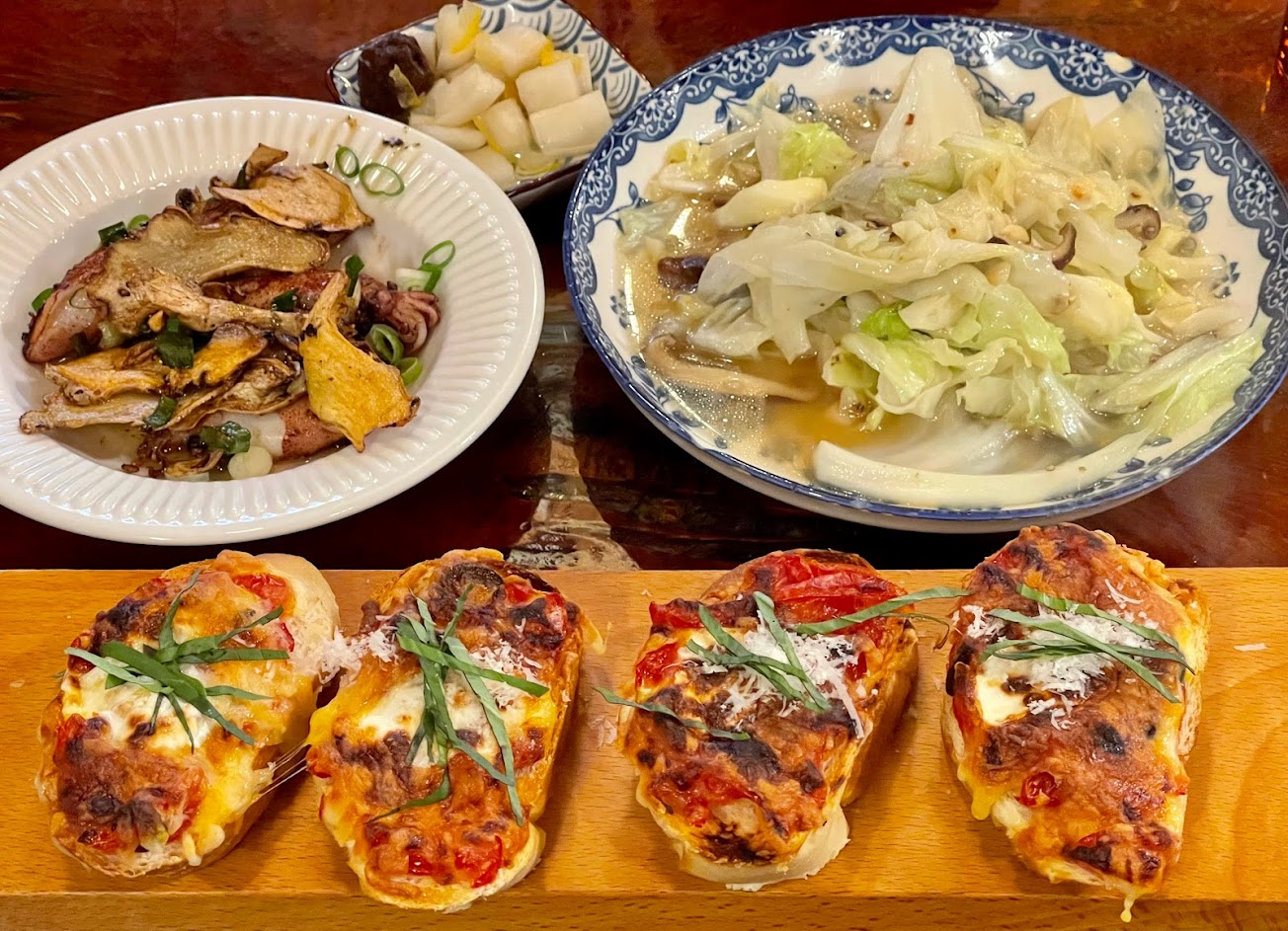 沒有食慾的我,點了焗烤番茄麵包、招牌一夜干、每日時蔬、貓飯及白飯