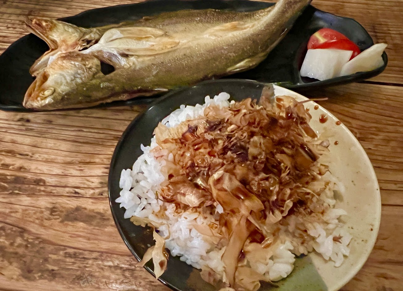 白飯淋上醬油後,再灑上柴魚片。白飯偏濕,個人沒有愛。