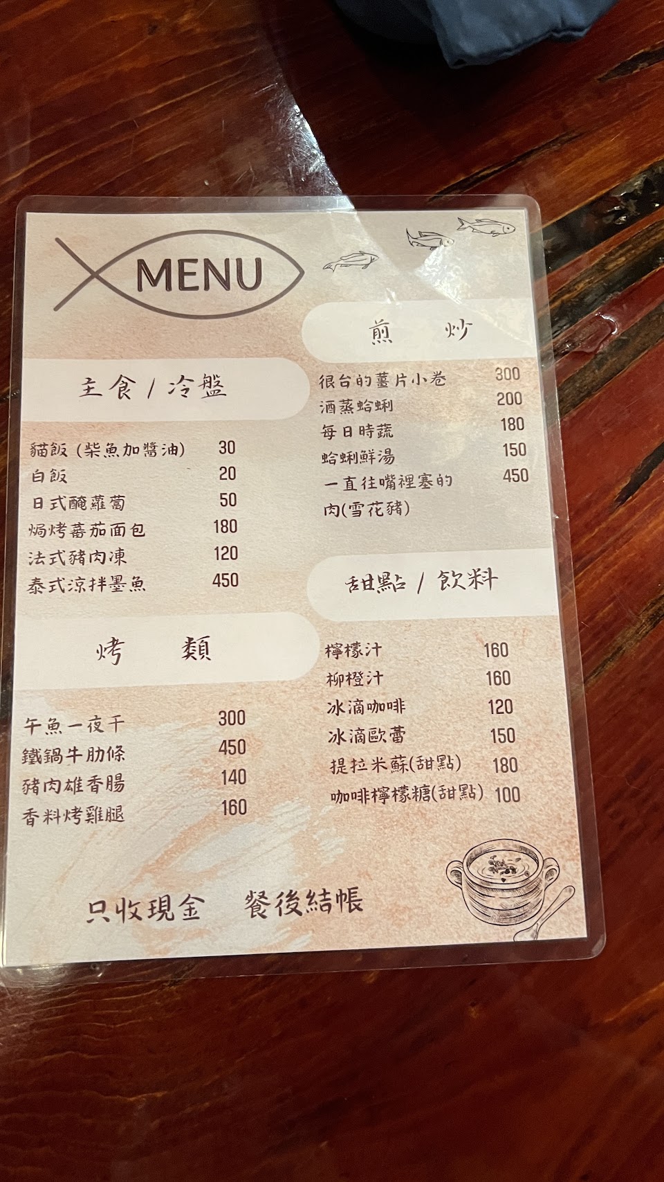菜單料理變化及選擇不大,法式豬肉凍Q彈有軟骨非常好吃,小卷鮮甜入味,搭配煎薑片味道很棒,炒青菜份量十足,一夜干略鹹且不水嫩,不是我的愛,鐵板牛肋條很不推薦,份量雖多但是筋多肉肥,吃起來很負擔,牙口不好的人要慎選。整體來說還行,候位大約需一個小時,建議開店前半小時排隊