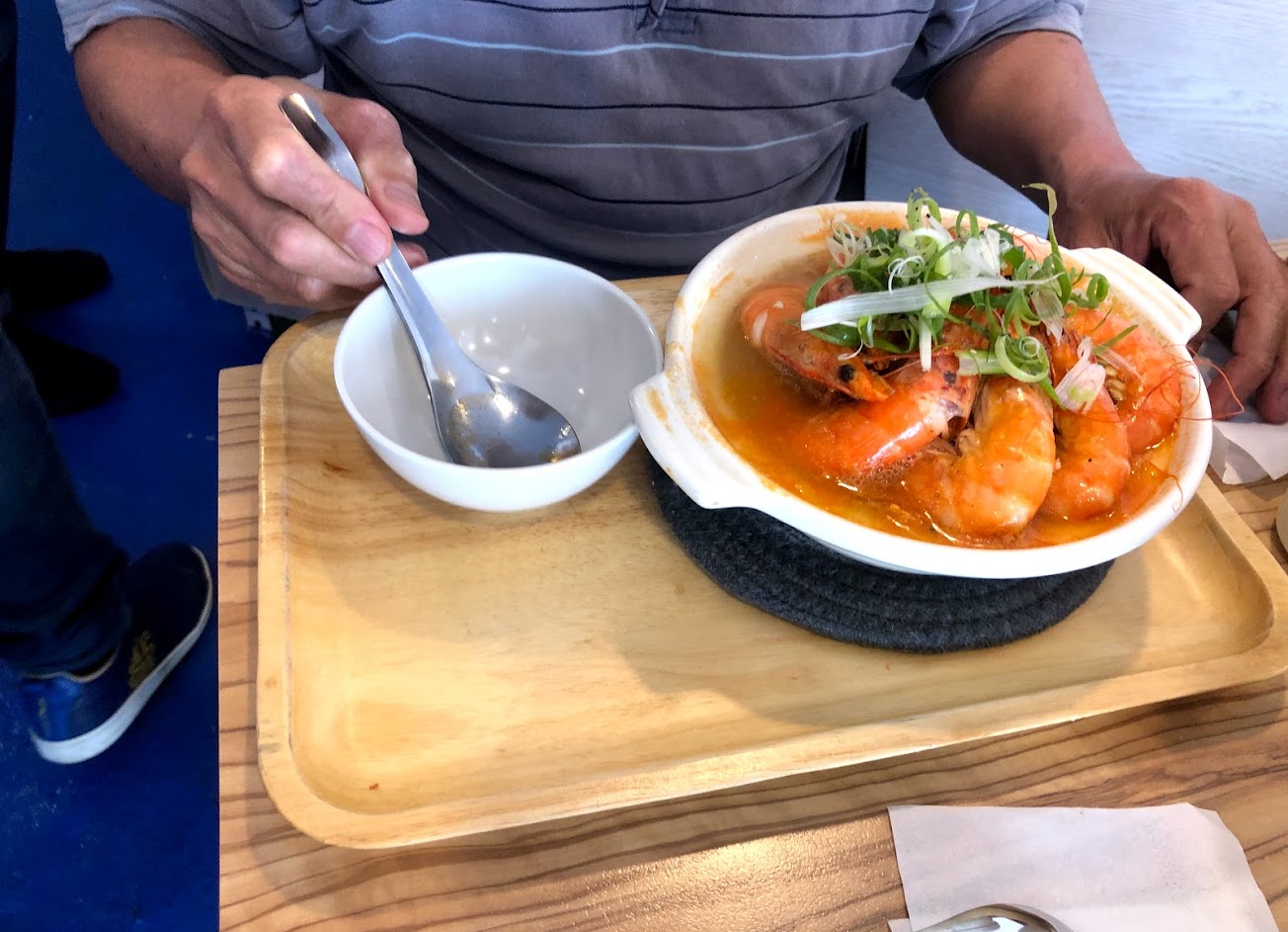 海鮮鍋 端來時裡面主要有一整隻螃蟹(大概2兩大), 雖然還有兩隻應該是胭脂蝦還是天使紅蝦還滿大的,但是跟生魚片擺在一盤是直接生吃的,我覺得比較可惜是沒有放在鍋裡一起煮,這樣湯應該更鮮甜,湯頭比較一般,沒有螃蟹的鮮甜味,過內的食材也少了點,好在這食材還算新鮮,紅蝦雖然是生吃但因為新鮮,吃下去入口即化,搭配窗外無敵海景,用餐還算舒適。