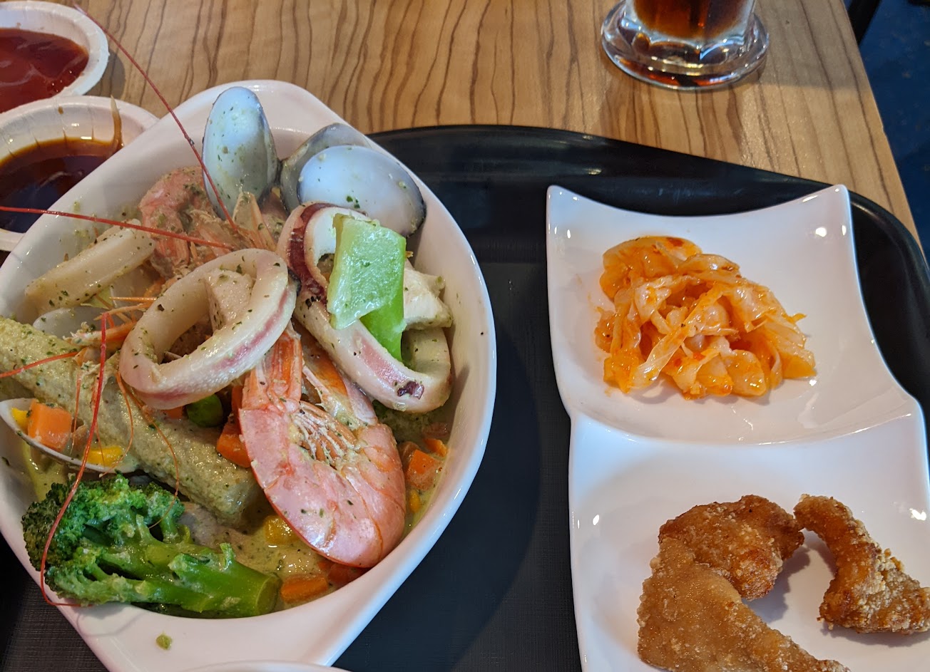 中午用餐 ?餐點:此次三大一小,點海鮮鍋、中卷粄條、魚米花、蝦、白醬蛤蜊義大利麵