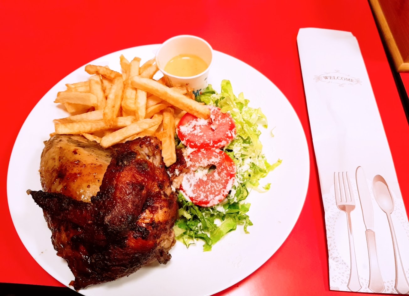 薯條比較鹹但味道不錯很脆,烤雞應該是有加微微的酸味醬料,及特製烤醬吃起來很入味口感很香雞肉也很軟嫩,好吃,另外他們有個紫玉米做成的飲料,喝起來超像烏梅汁很特別的口味,餐廳不大比較小,但東西好吃!