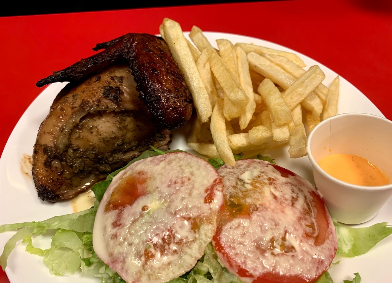 烤雞非常多汁,味道也很好,即使是雞胸的部位也完全不柴,沙拉跟薯條也都很讚,好吃!