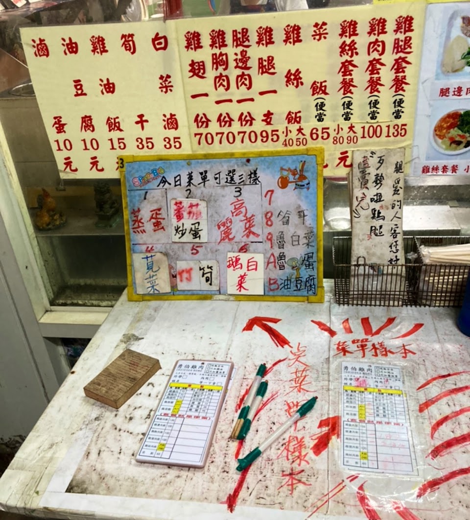 雞肉絲飯好吃。 內用流程:找座位,填菜單(便當可以選三種配菜,每日配菜的代碼都寫在牆上,直接把代碼寫在菜單即可),把填好的菜單插在櫃檯的傳票插,上菜時再付費,用完餐要自己把餐具拿去門外人行道的垃圾箱。 外帶流程:直接填菜單,然後插在傳票插,拿到餐再付錢。