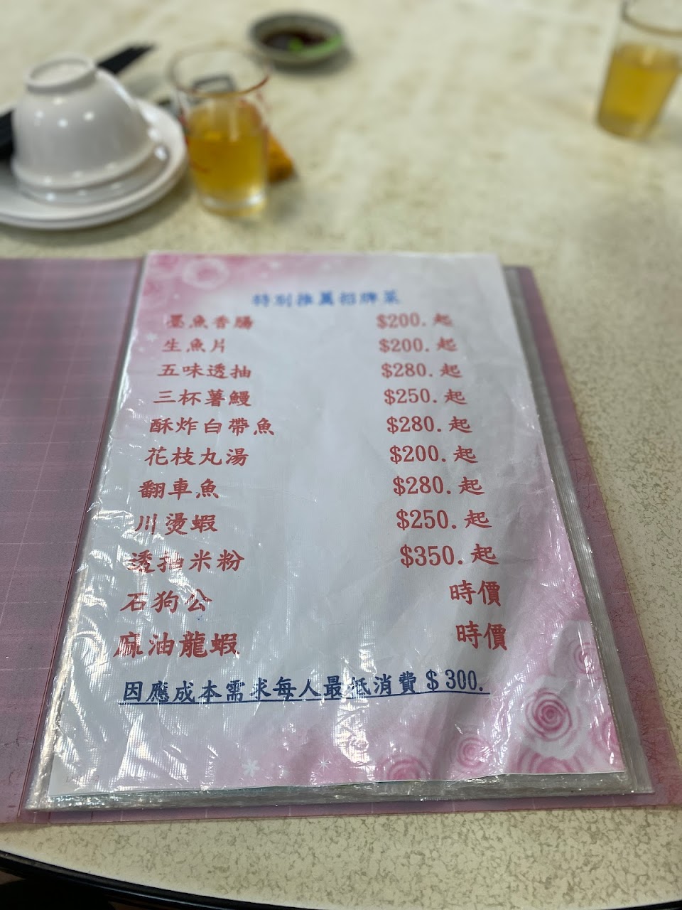 8個人吃5000的桌菜,完全吃不完。有專屬停車場,但位置不是很多,早點來最保險。東西我覺得料理的很不錯,推小卷米粉 跟 香腸,生魚片也好吃。桌菜才能定位~