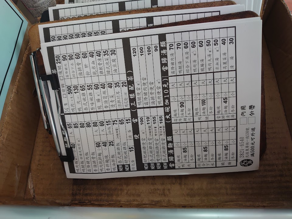 內用菜單在餐桌上,是白色的單子;外帶在外面是紅色單子。先結帳。有提供環保餐具。