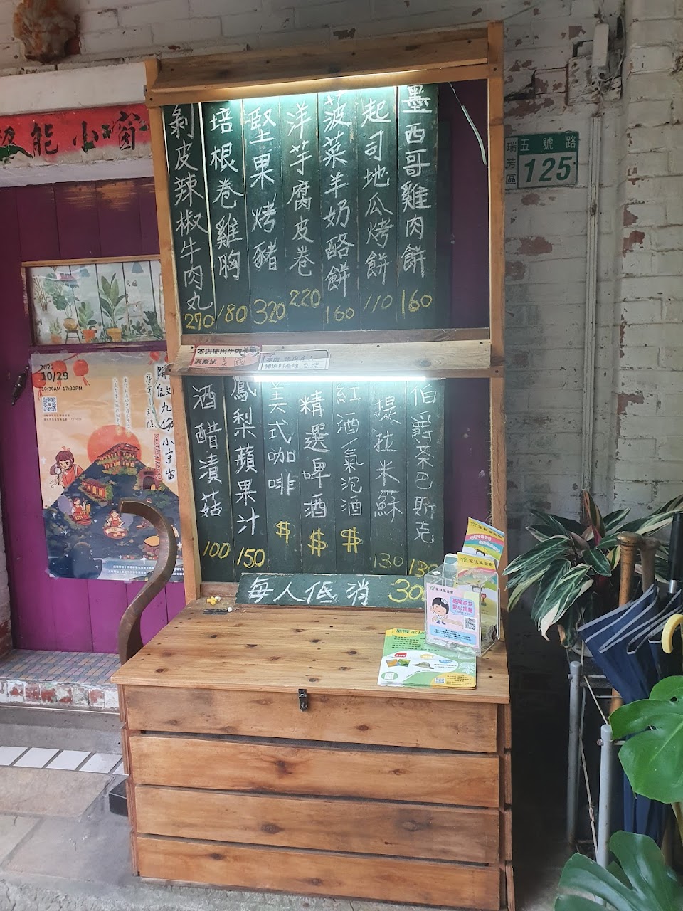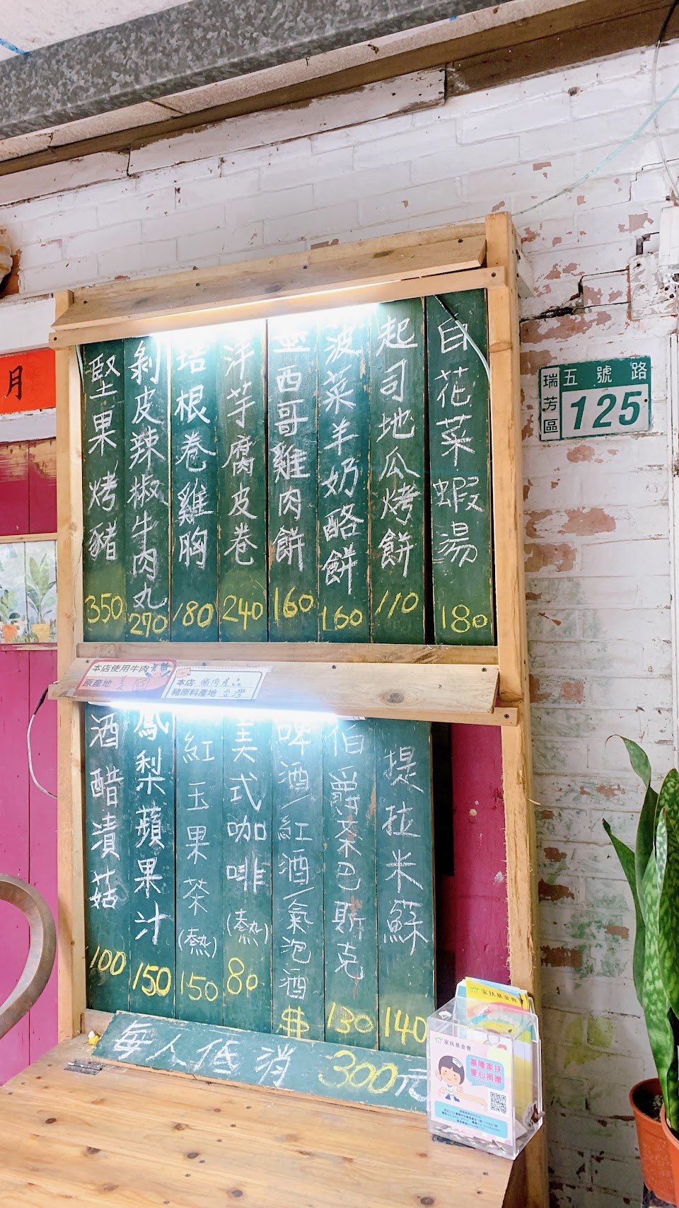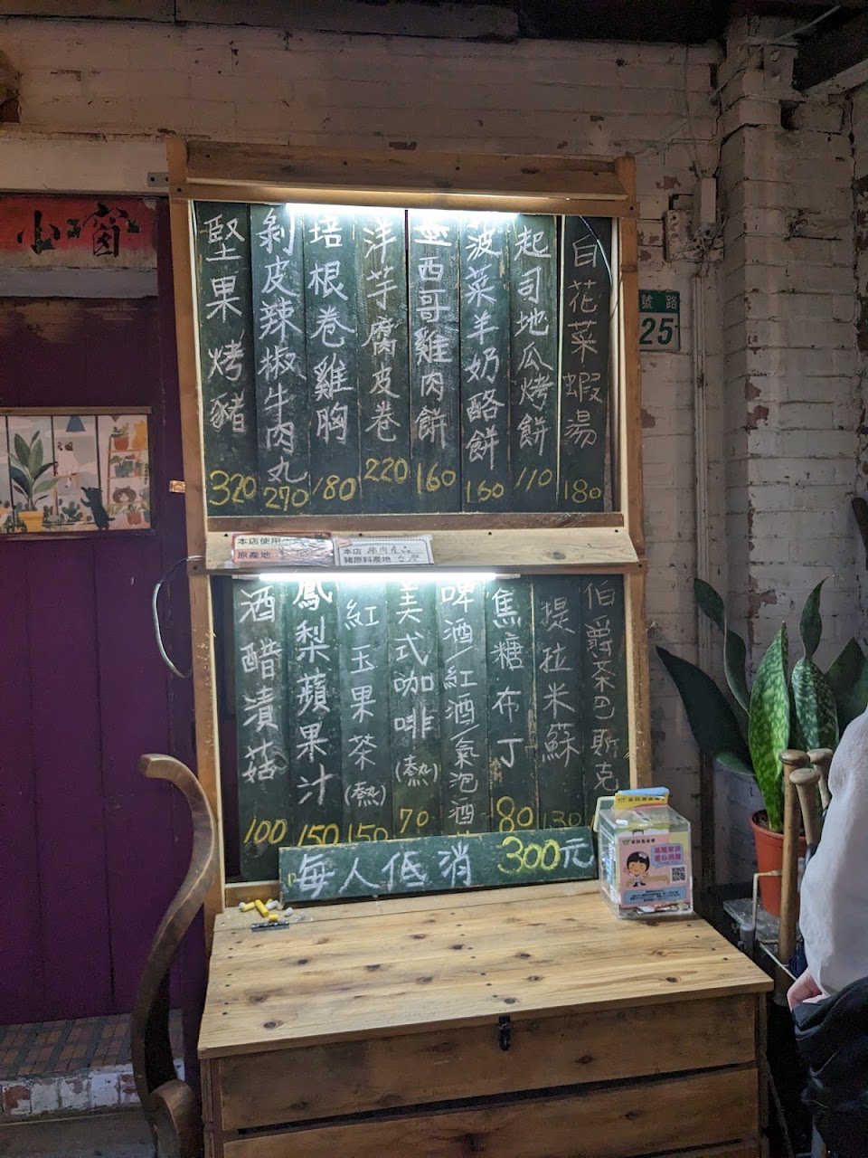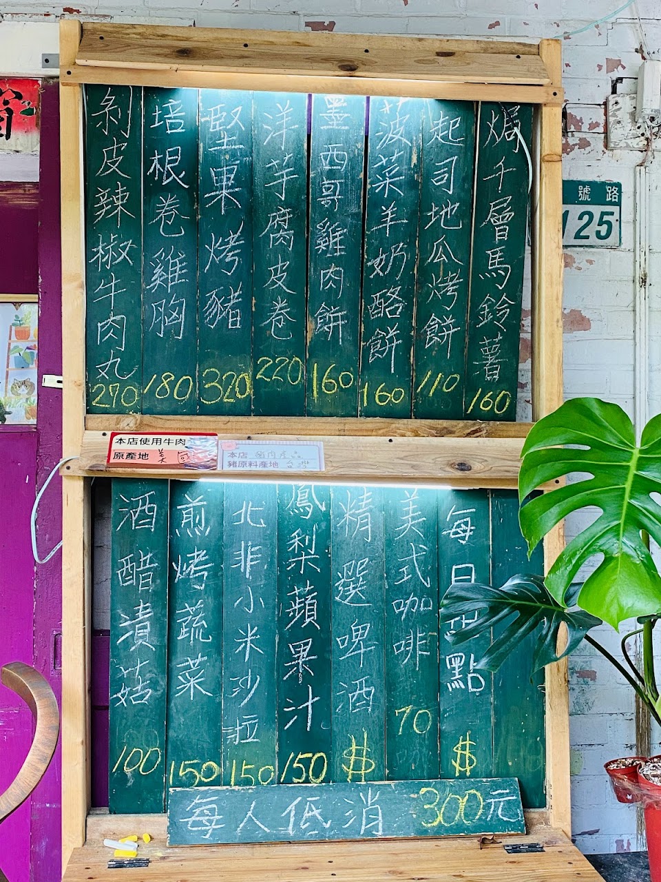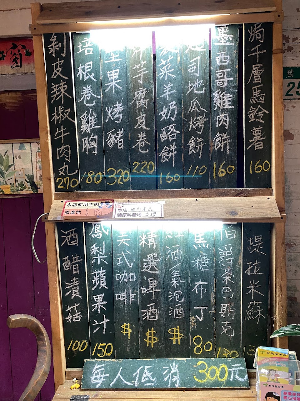 點餐是單點制,低消為三百元,只收現金。今日點了菠菜羊奶酪餅、洋芋腐皮捲、培根捲雞胸,剝皮辣椒牛肉丸。